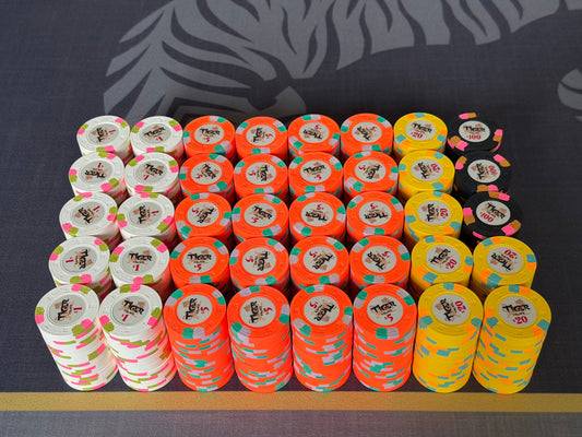 Tiger Palace (Paulson) relabeled $1/$2 Cash Set (Vegas colors, blaze orange $5s, yellow $20s) - 800 Chips