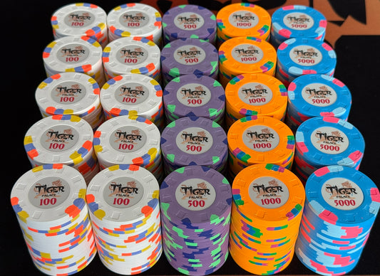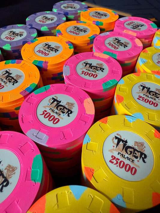 Tiger Palace has several very distinct 48mm sets: T100 tourney, T500 tournament and a unique one of a kind $0.25/$0.50 set. Below are the two T100 and T500 tournament sets. The cash set can be found here.