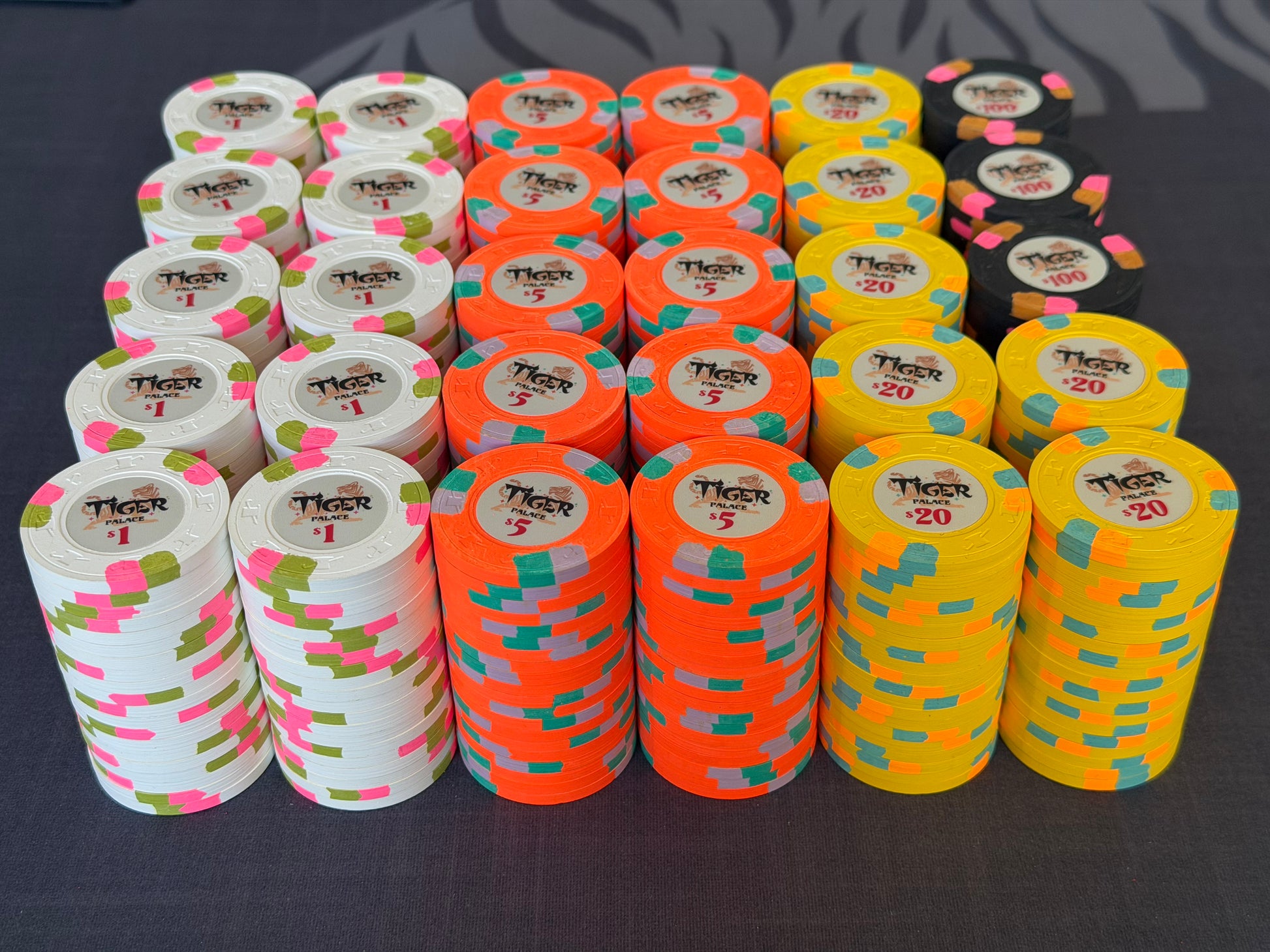 Tiger Palace (Paulson) relabeled $1/$2 Cash Set (Vegas colors, blaze orange $5s, yellow $20s) - 600 Chips (Copy)